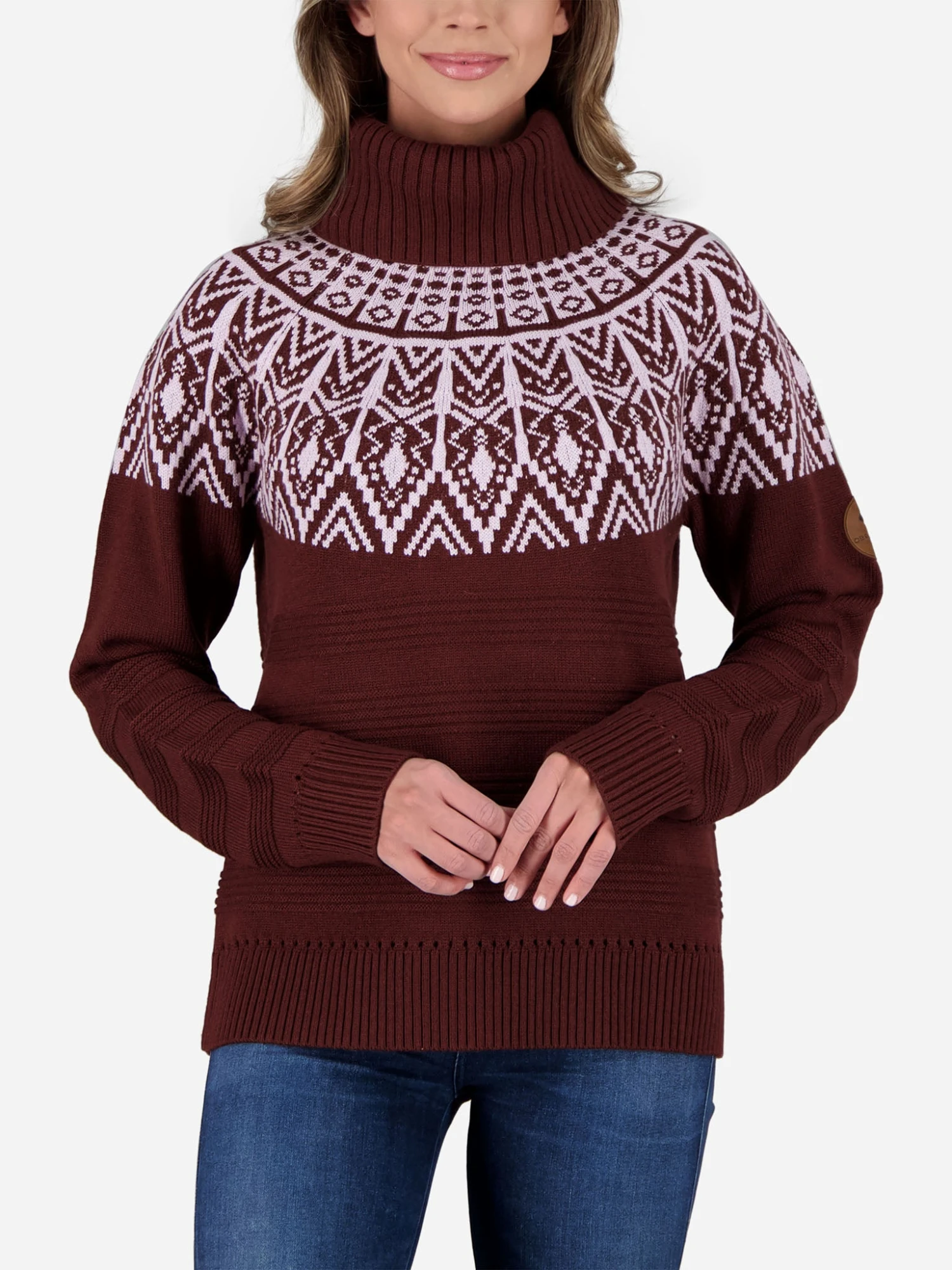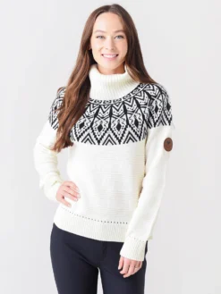 The Obermeyer Women’s Lily Turtleneck Sweater features a classic ski-inspired style with alpine patterning.